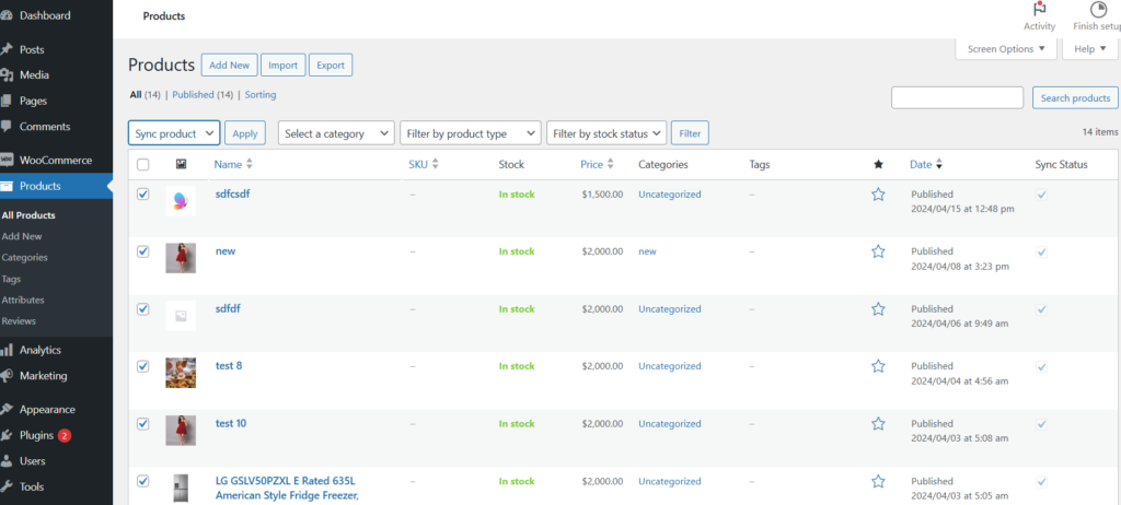 The Sync Product feature allows you to synchronize multiple products at once, ensuring that product information is updated across the site and any integrated systems. By selecting multiple products using the checkboxes beside each product name, you can apply a sync action to update stock levels, pricing, descriptions, or other details for those products simultaneously. This is particularly useful when managing a large inventory, as it saves time by updating multiple items in bulk rather than one at a time.