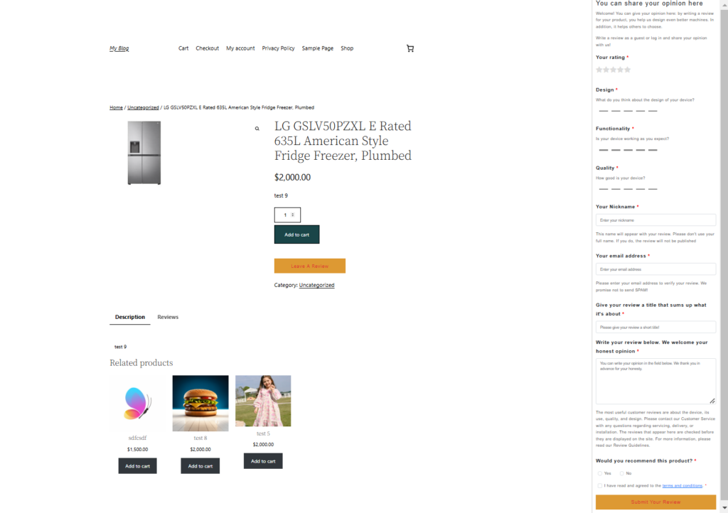 On the right side, there’s a review form with fields for rating, design, functionality, quality, nickname, email, review title, and review content. It includes radio buttons for recommending the product and a checkbox to agree to terms and conditions before submitting the review.