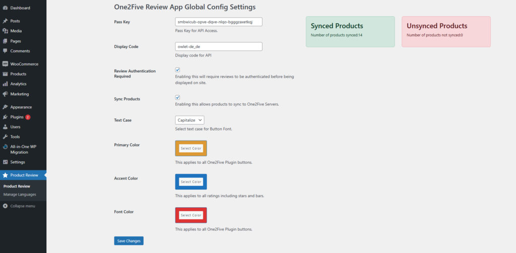 This setup allows users to manage One2Five Review App configurations effectively from the WordPress admin dashboard, controlling review authentication, product syncing, and visual customization of the review elements on their site.